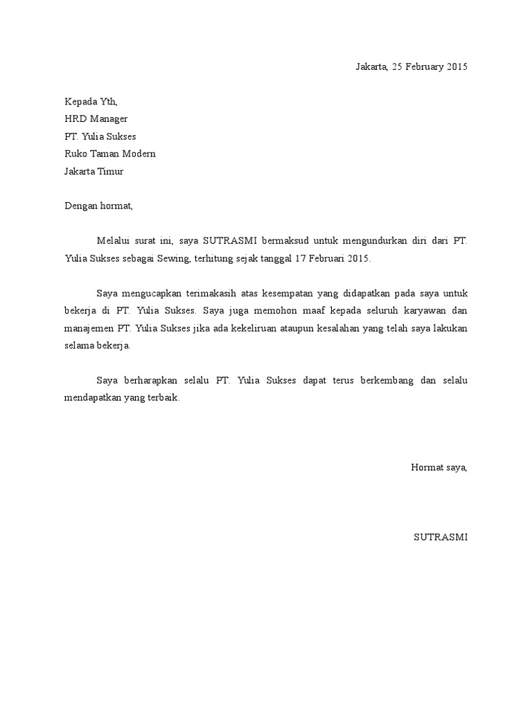 Kepada bapak ketua lembaga pendidikan di desa somodaran solo di tempat. Mengajukan pengunduran diri dari rsud dr soetomo terhitung mulai tanggal 1 maret 2012 dengan alasan mengikuti suami di jombang. Pernyataan pengunduran diri dari kelompok tani contoh surat pernyataan pengunduran diri dari serikat pekerja contoh. Terkadang ada banyak hal disaat kita bekerja di sebuah perusahaan atau instansi yang membuat kita. Meskipun telah mendapatkan pekerjaan baru yang lebih baik, sebaiknya kamu tetap membuat surat pengunduran diri.